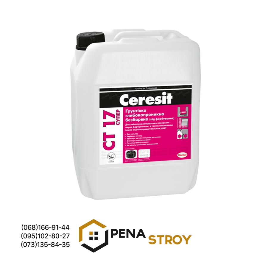 Грунтовка Ceresit СТ 17 предназначена для укрепления и пропитки пористых, непрочных и сильно впитывающих оснований (лёгкий бетон, штукатурка, гипсовые и кирпичные поверхности), увеличения адгезии к основанию материалов Ceresit.