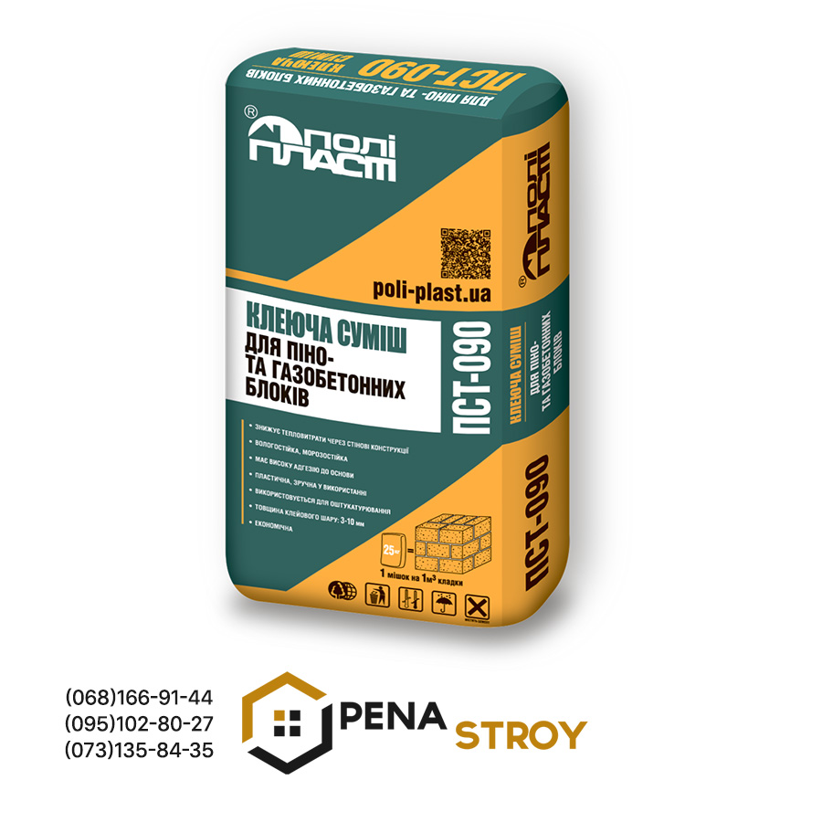 Клей «ПСТ-090» — готовая сухая клеевая смесь для кладки мелких блоков и панелей из ячеистого бетона (пено-, газобетон), известняка и других легких стеновых блоков; для крепления теплоизоляционных газо- и пенобетонных панелей и аналогичных теплоизолирующих материалов на основу, что не деформируется (бетонная, цементная, цементно-известковая, кирпичная).