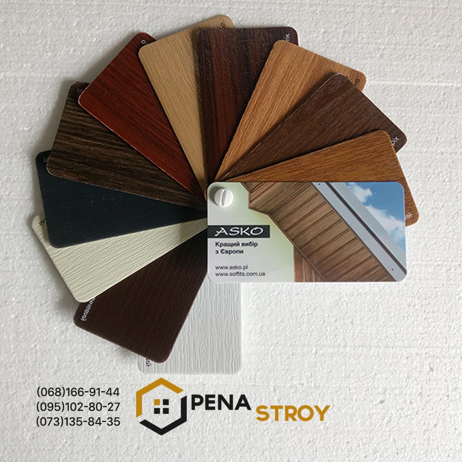 ASKO это лидер рынка ПВХ софитов в Украине. Обладает наибольшим выбором цветов на рынке: 4 однотонных цвета и 7 текстур «под дерево». Гарантия 10 лет, а срок службы до 25 лет